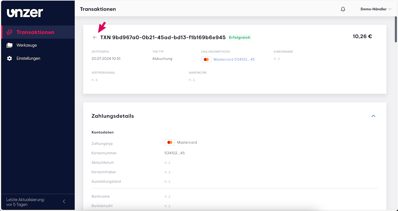 Mit einem Klick auf den Pfeil nach links neben dem Transaktionsnamen gelangen Sie in die Transaktionsübersicht zurück.