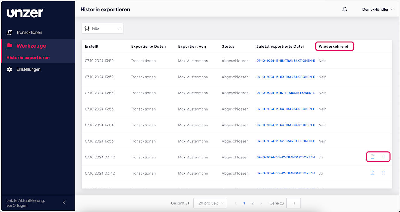 Bei wiederkehrenden Exporten befinden sich am Ende der Zeile zwei Symbole:
