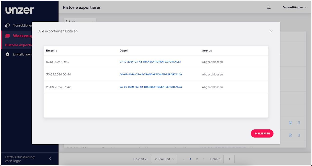 Klicken Sie in dieser Übersicht in der Spalte Datei auf den Namen des gewünschten Exports, um diesen herunterzuladen.