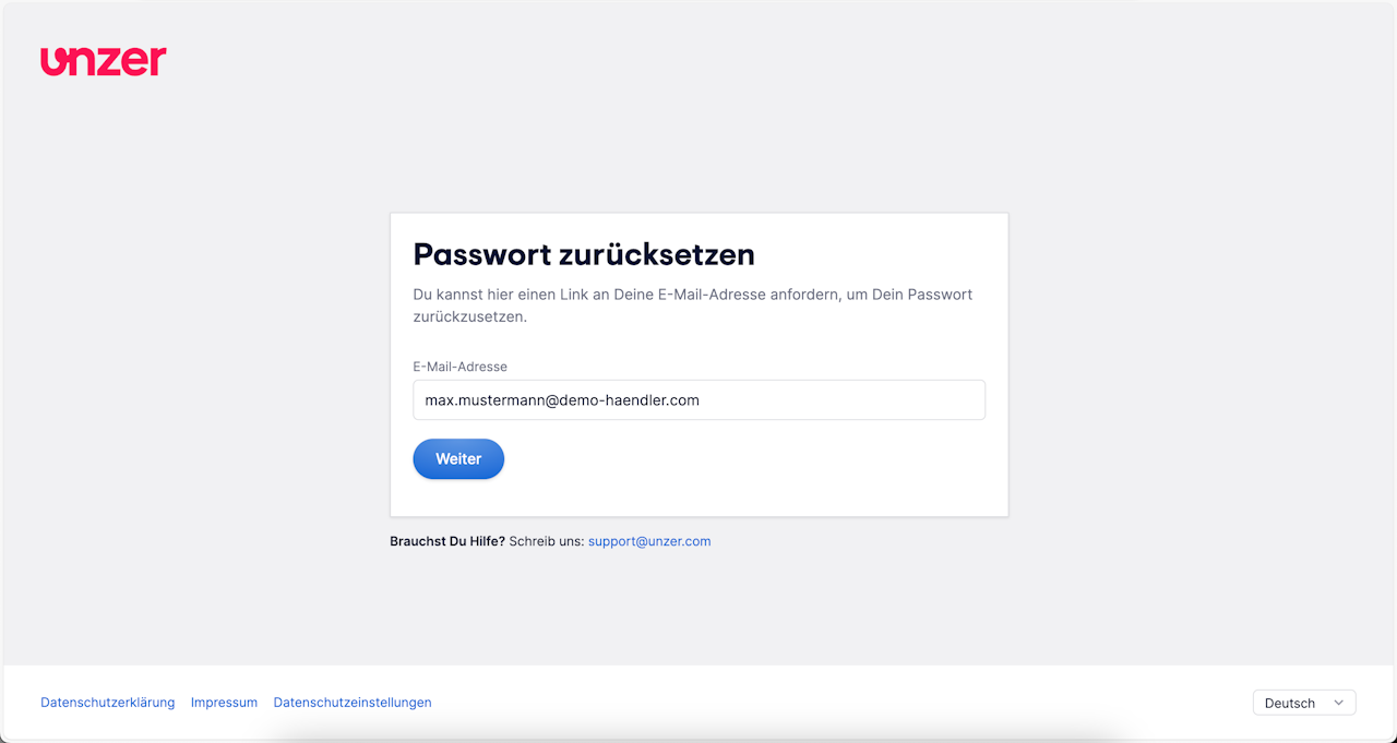 Geben Sie im angezeigten Bildschirm Passwort zurücksetzen Ihre E-Mail-Adresse ein, mit der Sie sich bei UnzerOne registriert haben, und klicken Sie auf Weiter.