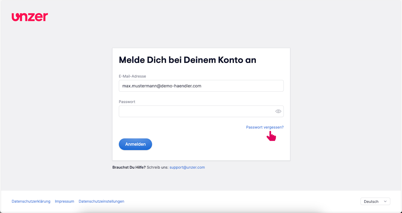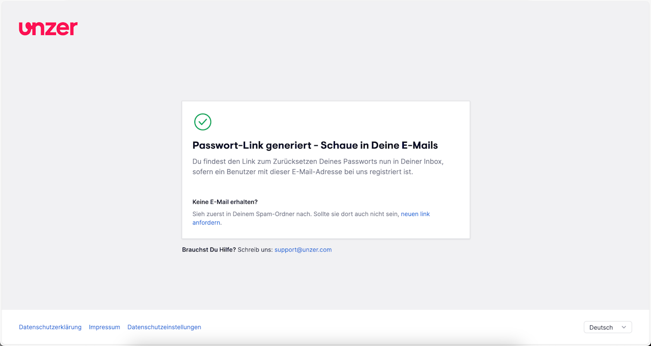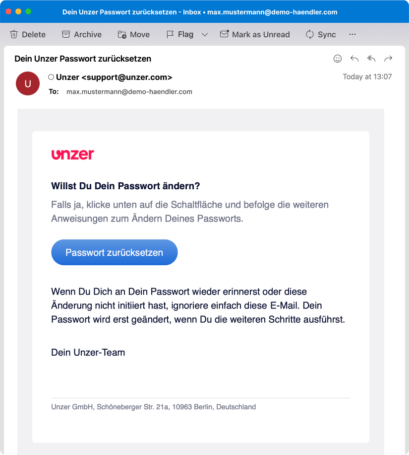 Wechseln Sie jetzt zu Ihrem E-Mail-Posteingang und halten Sie dort nach einer E-Mail von Unzer zum Zurücksetzen des Passworts Ausschau.