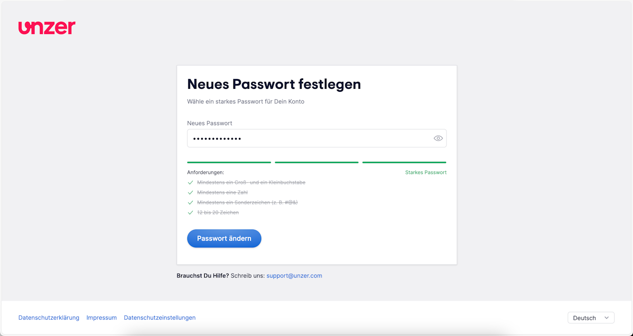 Ihr Passwort wird geändert, und Sie gelangen automatisch in Ihr UnzerOne Dashboard Konto.