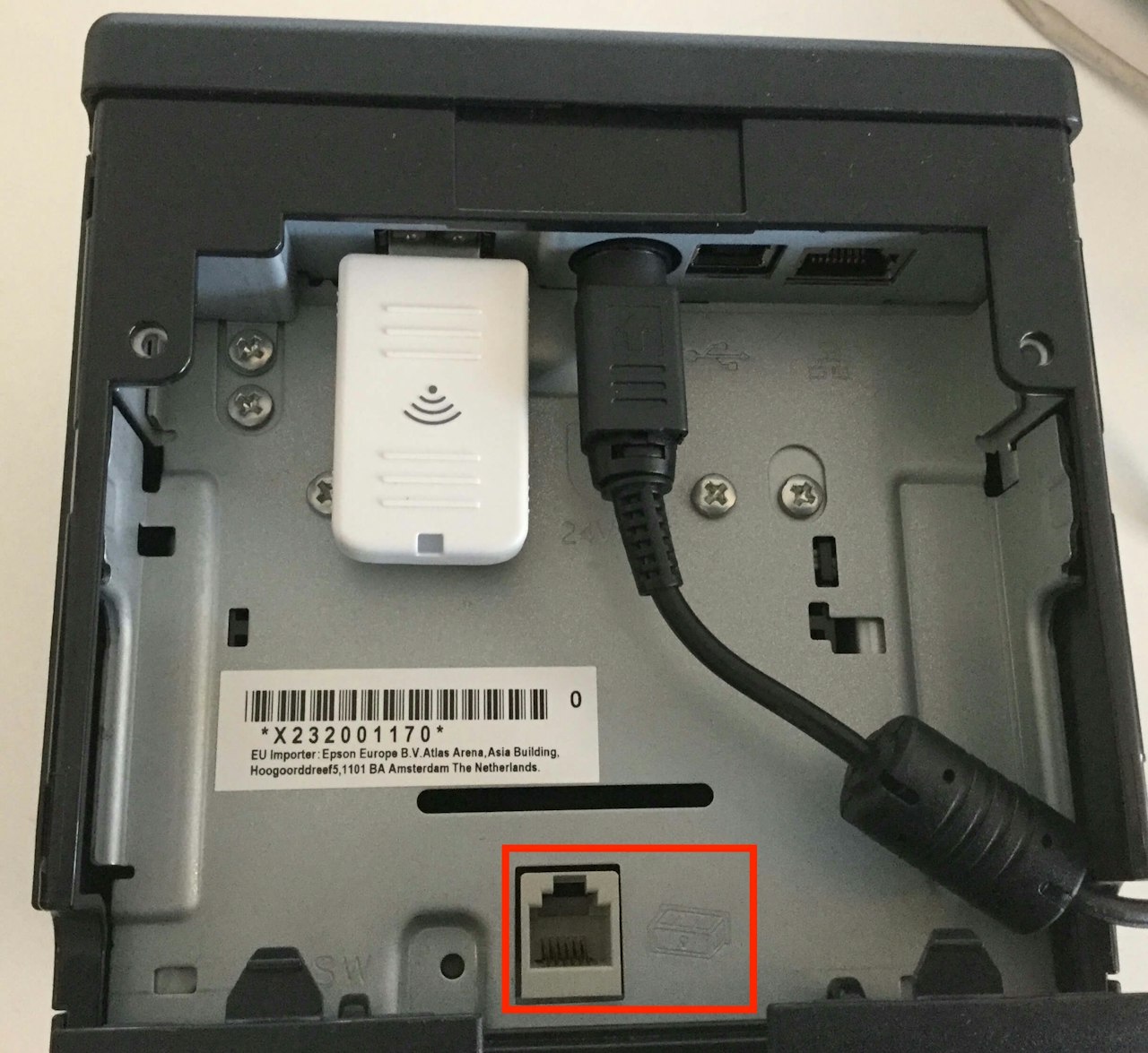 Öffnen Sie nun die untere Abdeckung des Druckers und stecken Sie das Kabel der Kassenlade in die entsprechende Buchse (auf dem Foto rot markiert).