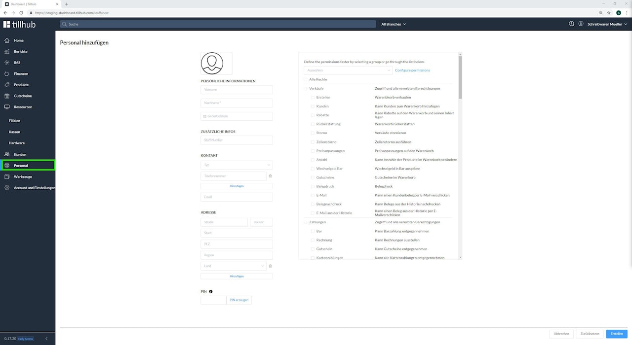 Der "+ Neu" Button leitet Sie in den Bereich, in welchem sie neue Mitarbeiter anlegen können. Hier haben Sie umfangreiche Optionen, um Ihren Mitarbeitern jegliche Befugnisse zu erteilen und eine PIN zuzuweisen.
