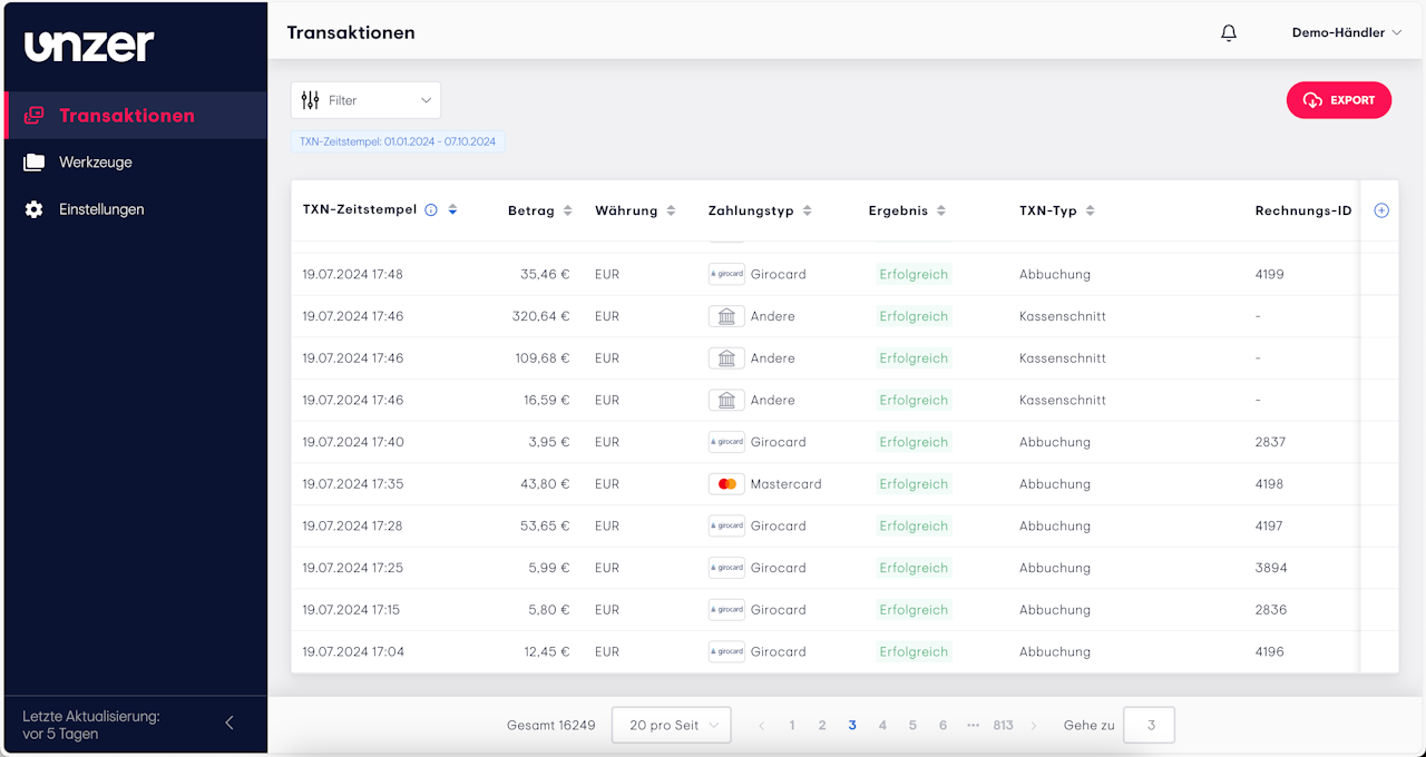 Daraufhin sehen Sie eine Auflistung Ihrer Transaktionen in tabellarischer Form mit einigen zugehörigen Angaben wie Zeitstempel, Betrag, Währung, Zahlungstyp, Ergebnis und weitere.