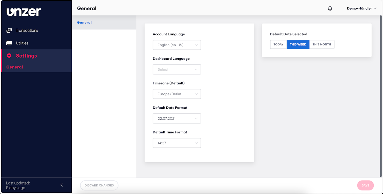 You can easily customize your UnzerOne dashboard to fit your needs by adjusting language, timezone, date, and time formats, as well as the default date range for viewing transactions.